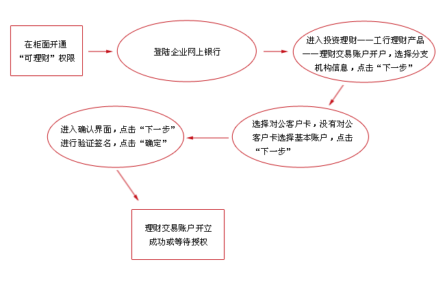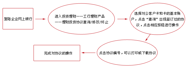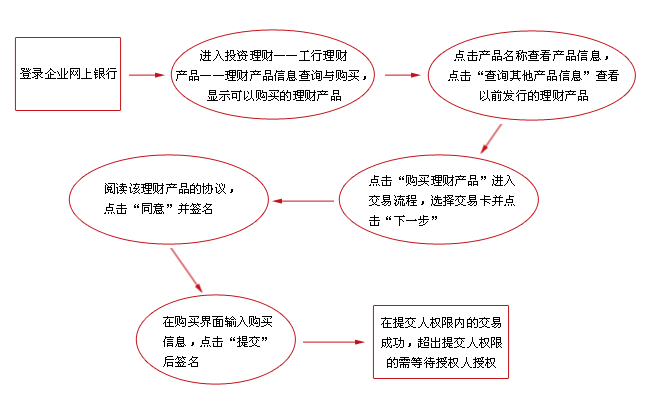● 如何利用企业网上银行购买产品? 1. 理财账户开立:查看流程 2. 理财产品信息查询与购买:查看流程 3. 理财产品持有份额查询/赎回/终止:查看流程 4. 理财交易撤单:查看流程 5. 理财交易账户销户:查看流程 6. 理财交易指令批复:查看流程 7. 理财投资协议查询/修改/终止:查看流程